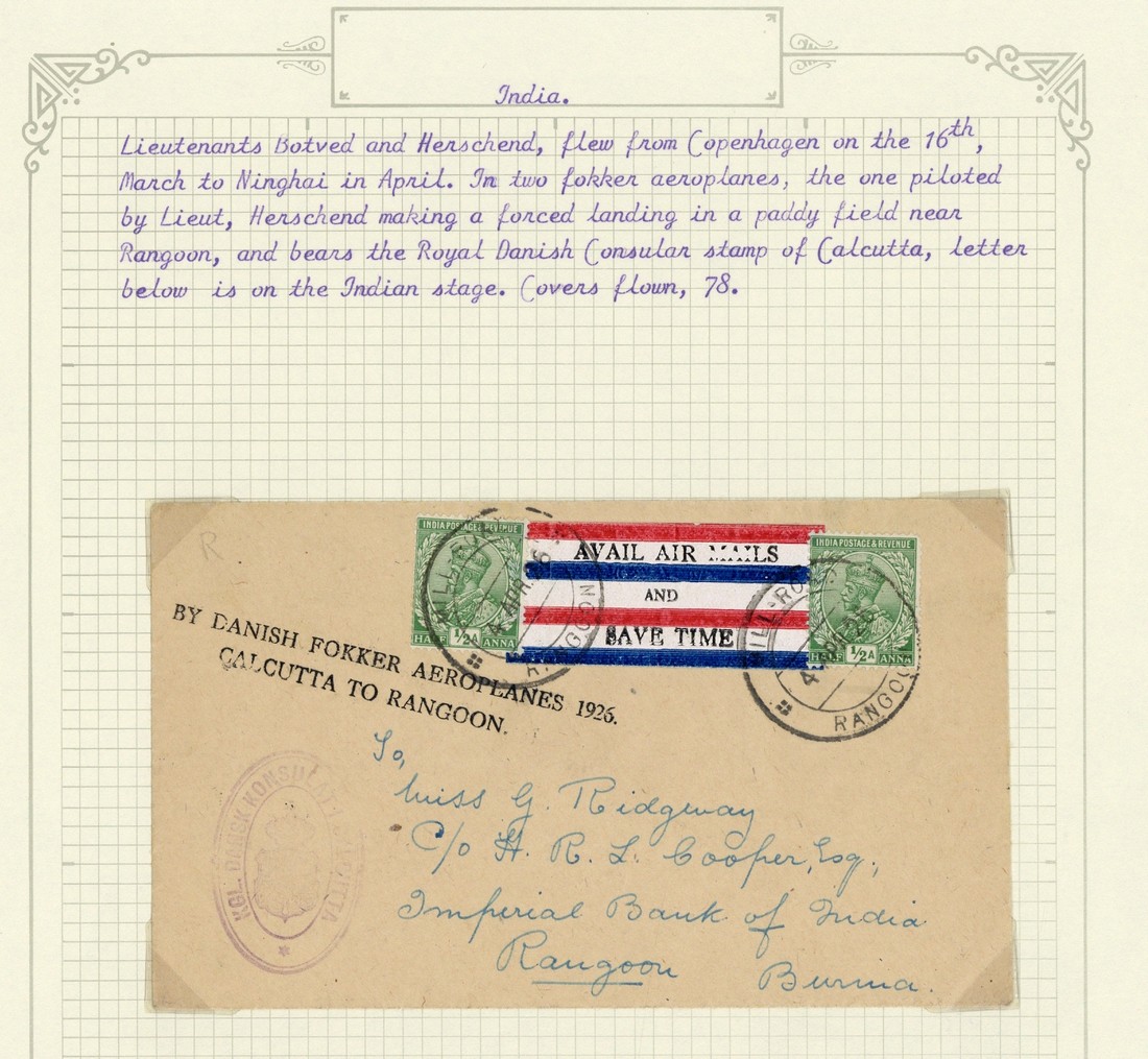 1926 (Apr.-May) Copenhagen-Ninghai flight by Lieutenants Botved and Herschend, envelope dated 4 April and carried on Calcutta-Rangoon stage bearing ½a. (2) with Rangoon c.d.s., the other on Calcutta-Tokyo stage when pane was captured by bandits and set on fire, bearing uncancelled 1a. and 2a., both with Royal Danish Consular handstamp and the latter with 23 May arrival notation