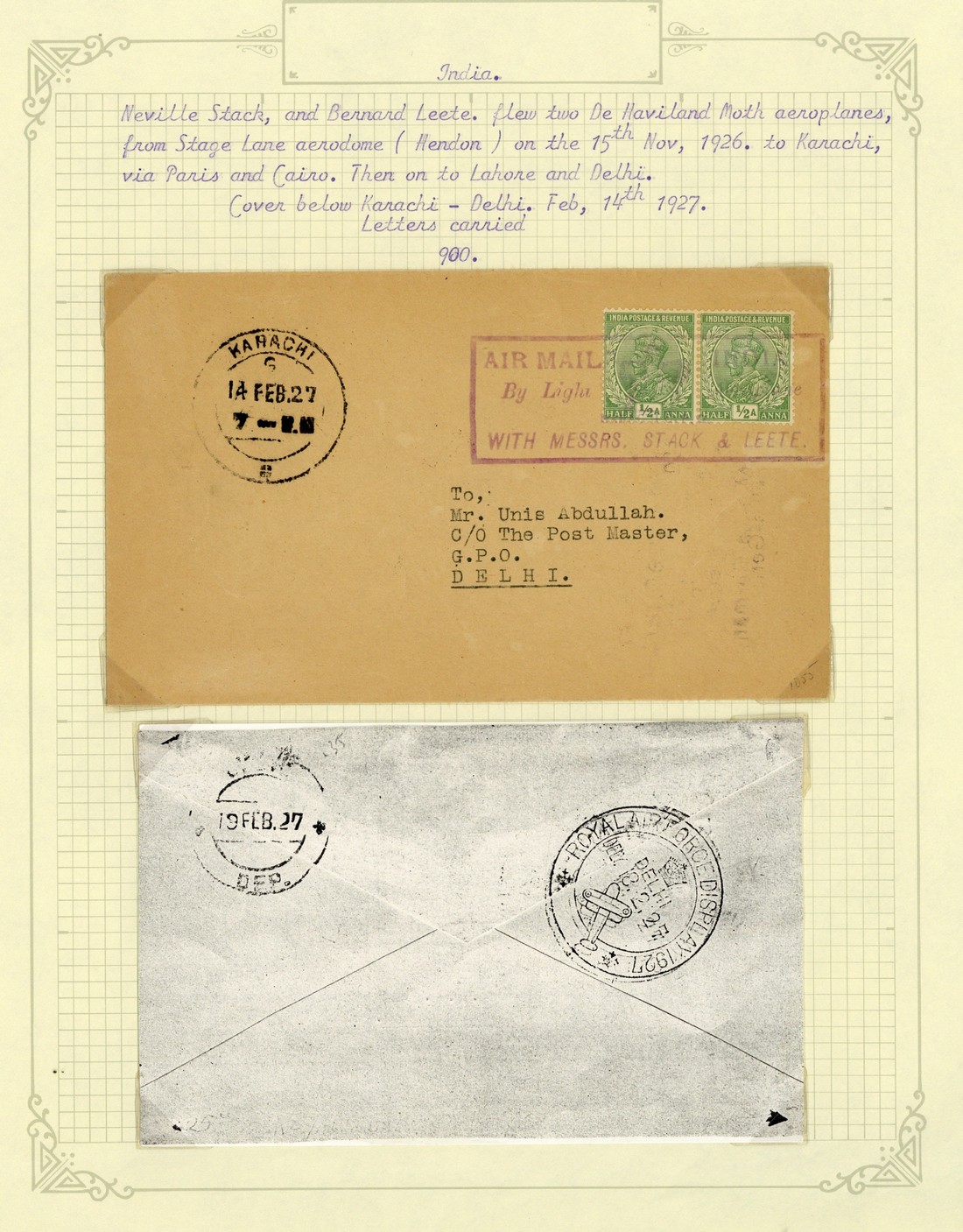 1927 (14 Feb.) Hendon-Karachi by Stack and Leete, envelopes carried from Karachi to Delhi and Rawalpindi, both franked at 1a. cancelled by flight cachet and with despatch c.d.s. on face, R.A.F. Display and arrival c.d.s. on reverse