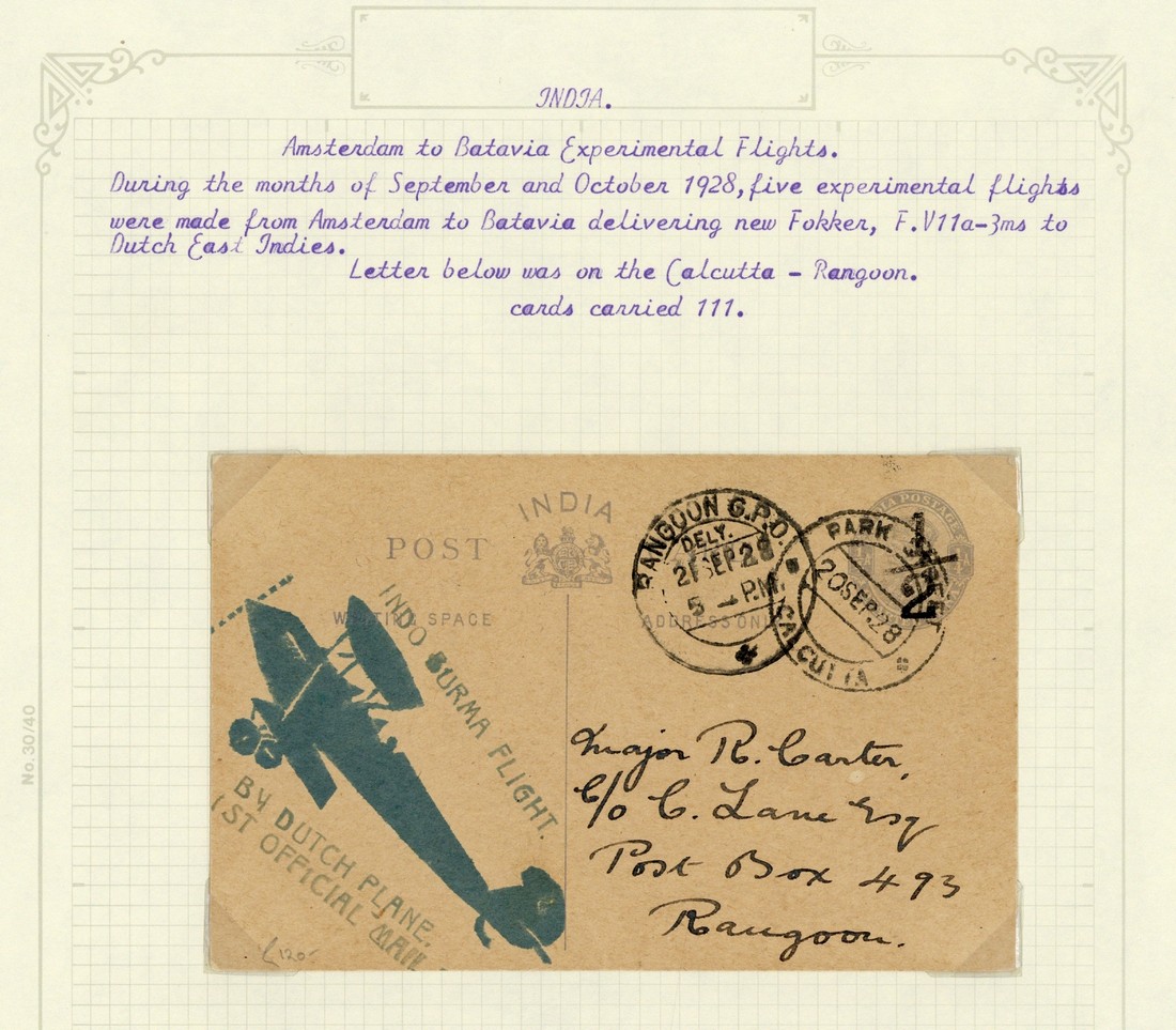 1928 (20 Sept.) Amsterdam-Batavia Experimental flights by new Fokker aircraft, ½a. on ¼a. card from Calcutta to Rangoon with "indo burma" illustrated cachet in green, and (11 Oct.) Amsterdam-Batavia Experimental flight by Capt. Waltmann, envelope from Calcutta to Rangoon with flight details printed and bearing 1a. with despatch c.d.s.