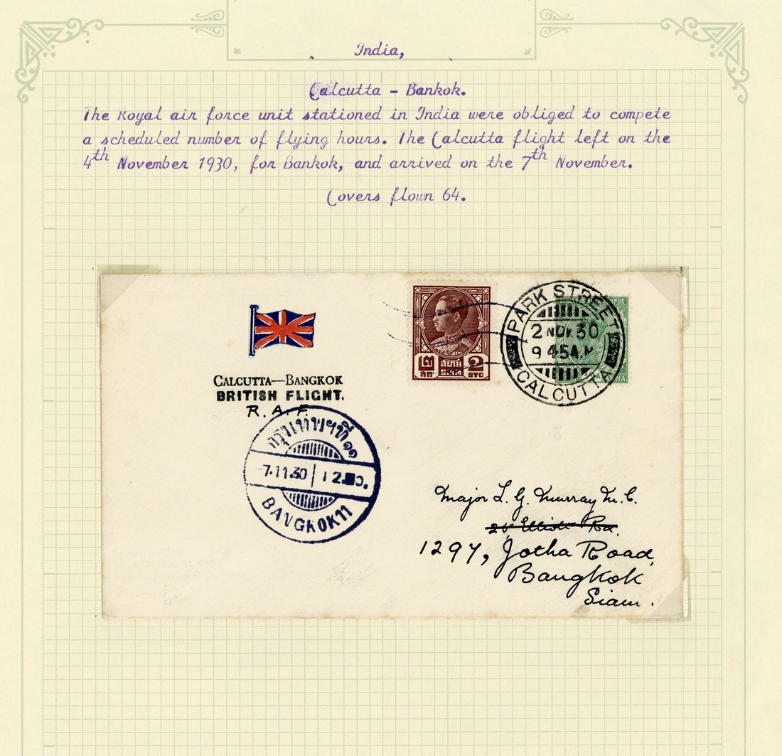 1930 (Nov.) R.A.F. flights due to being obliged to carry out a scheduled number of flying hours, 2 November envelope from Calcutta to Bangkok bearing ½a. and Thai 2bt. with flight details and arrival c.d.s., and 19 November envelope (light tones) from Allahabad to Delhi bearing 1a. and showing 1st. Bt. The Cheshire Regt. oval dated cachet in violet