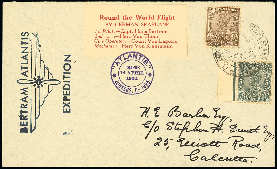 1932 (22 Apr.) Round the World flight by Capt. Hans Bertram, Calcutta-Rangoon stage envelope franked at 1a.3p. and bearing red on white label tied by "Atlantis" cachet in violet and with "Bertram Atlantis Expedition" cachet in grey-blue at left. Scarce. Photo