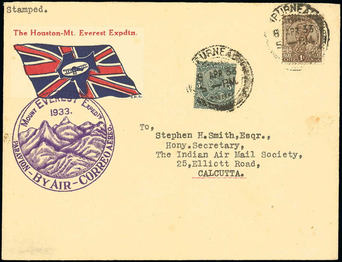 1933 (8 Apr.) Purneau-Mount Everest flight envelope to Calcutta, franked at 1a.3p. and bearing flight "Union Jack" label tied by "mountains" cachet in violet with a further strike on reverse, scarce. Photo