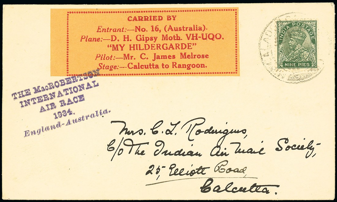 1934 (20 Oct.) MacRobertson Air Race, Calcutta-Rangoon stage envelope franked at 9p. and bearing James Melrose label tied by flight details cachet; scarce with only 32 flown. Photo