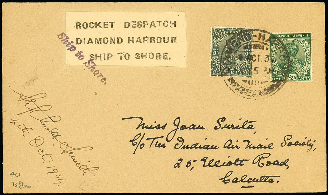 1934 (4 Oct.) Diamond Harbour Hilsa fishing boat envelope bearing "rocket despatch/diamond harbour/ship to shore." label tied by "Ship to Shore." cachet. Scarce with only 75 flown. Cooper 4. photo