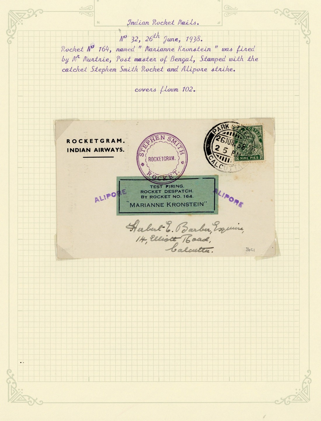 1938 (26 June) Rocketgram card bearing green "Marianne Kronstein" label tied by "Alipore" cachet, Rocketgram missive bearing magenta "Gertrude Collins" label, and plain missive with "Dick Turpin" cachet. Cooper 32-34