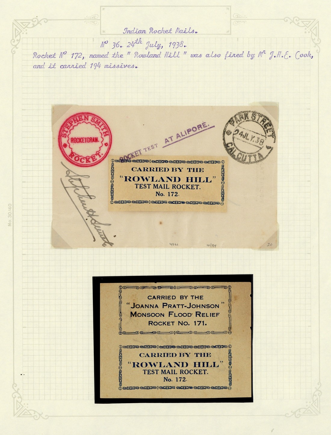 1938 (24 July) missives bearing "Joanna Pratt-Johnson" and "Rowland Hill" labels tied by Alipore cachets, the two unused labels se-tenant. Cooper 35, 36