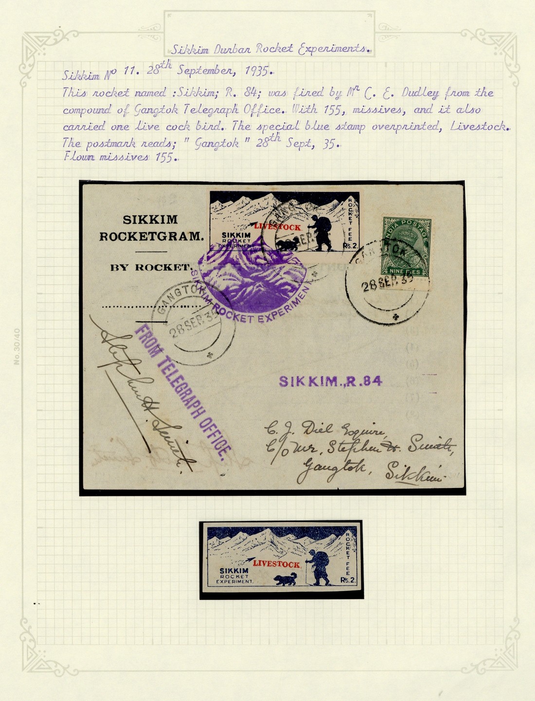 1935 (27-29 Sept.) Rocketgram missives (4), comprising Sir Tashi Namygal Field to Gangtok P.O. with "parcel" label, Gangtok Telegraph Office bearing "livestock" label, "Commander Norcock" bearing red label and "Oryon" bearing purple label, both fired by the Maharaja, the second accompanied by unused label. Cooper S10-13