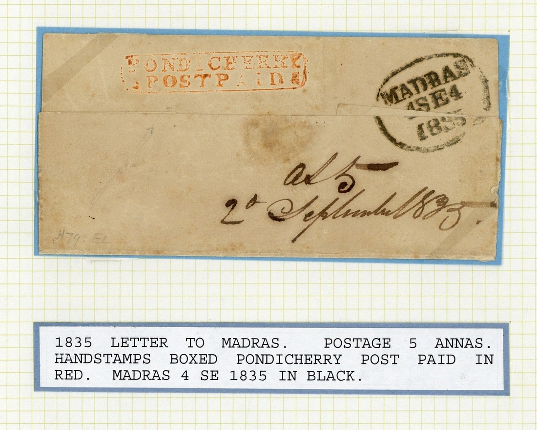 1835 small entire to Madras showing, on reverse, framed "pondicherry/post paid" in red and arrival oval datestamp (4.9)