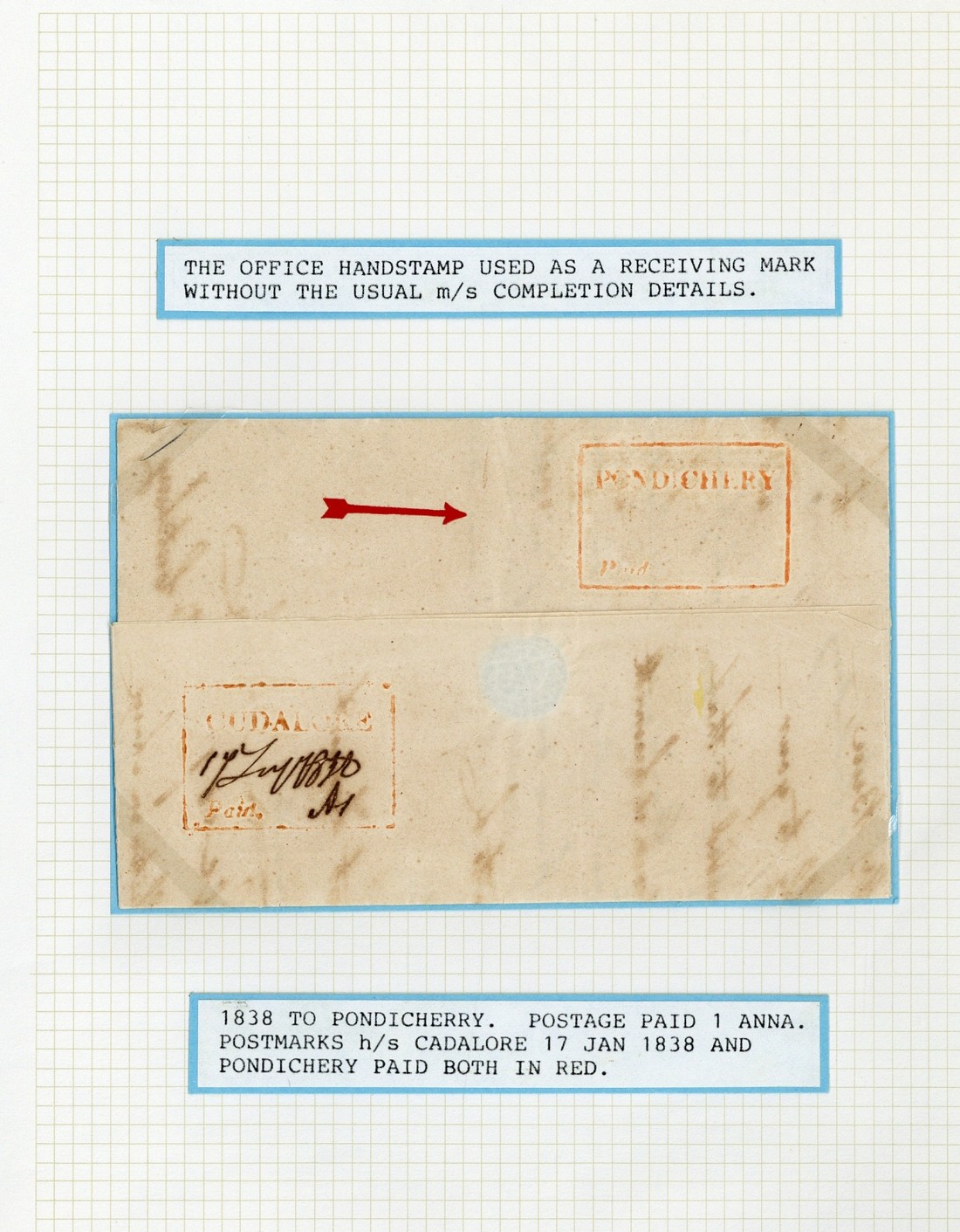 1838-53 entires/entire letters (8) to France, four with boxed "pondichery/Paid", three with boxed "pondicherry/Paid" and one without mark of origin except sender's cachet, various transit marks; generally fine
