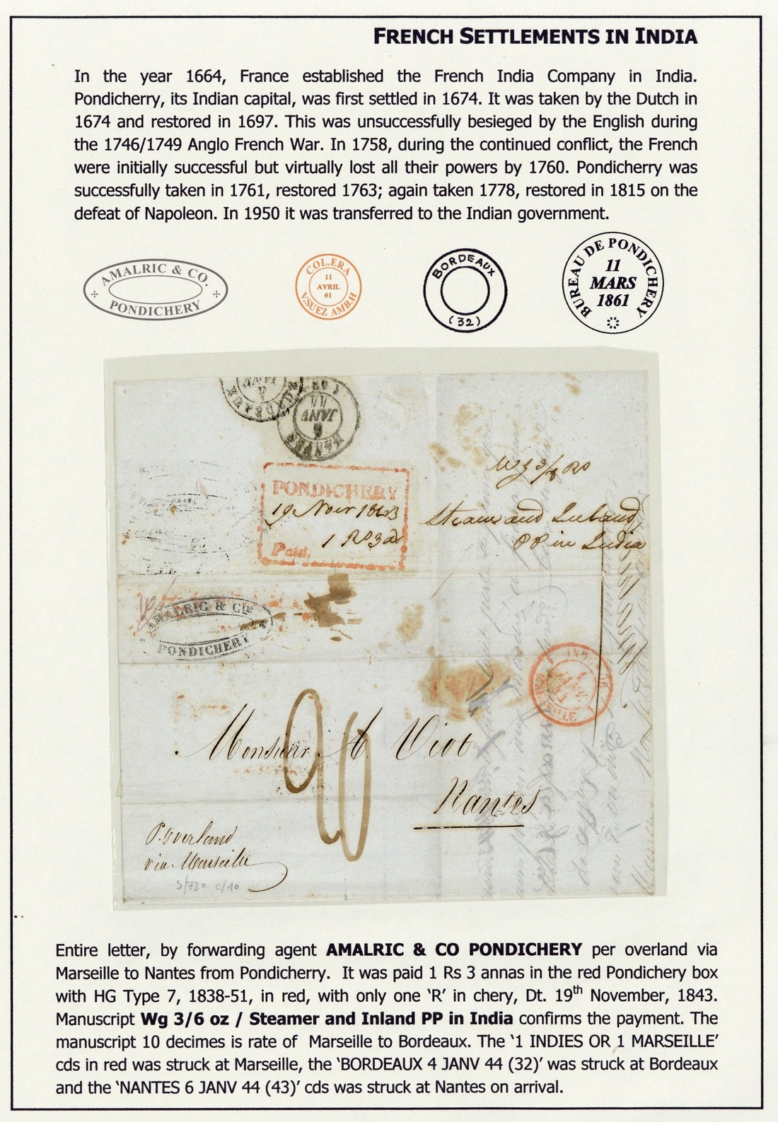 1843-62 entire letters (9) to France, showing framed "pondichery/Paid" (3, one with "slides"), "pondicherry/Paid" (3) and "bureau de pondicherry" c.d.s. (3), and range of transit markings