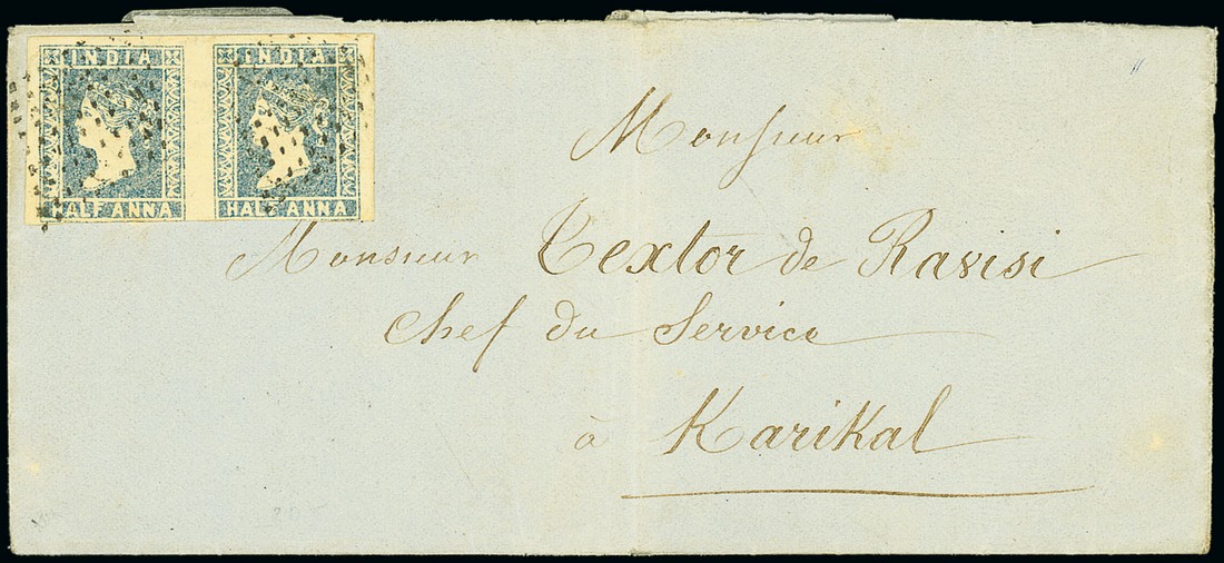 1855 (13 Mar.) entire letter to Karikal, bearing 1854 ½a. Die I pair twice neatly cancelled by diamond of dots and showing, on reverse, legible "Paid" datestamp; small faults on flap, otherwise fine. Scarce. Photo