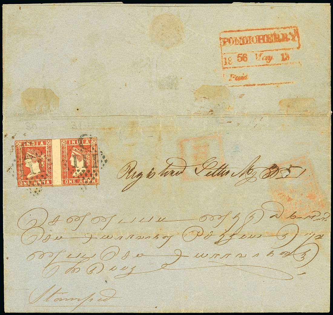 1856 (13 May) entire letter registered to Madras, bearing 1a. Die II pair (cut close or touched in places) both clearly cancelled "C/111" and with two arrival marks towards right, despatch "Paid" datestamp on reverse. An early item of registered mail from this office. Photo