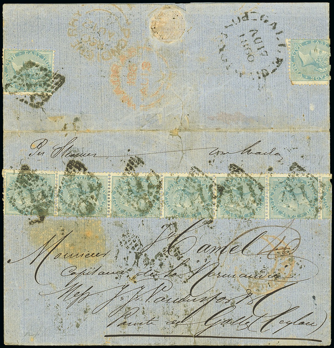 1860 (12 Aug.) entire letter registered to Galle, Ceylon, bearing ½a. blue vertical strip of seven (one wrapped round on to reverse and defective) and a single (on reverse) all cancelled "C/111", showing "india paid" on face and, on reverse, "pondicherry/red" double-arc datestamp, Madras (13.8) and arrival (17.8) c.d.s. A rare and unusual registered franking. Photo