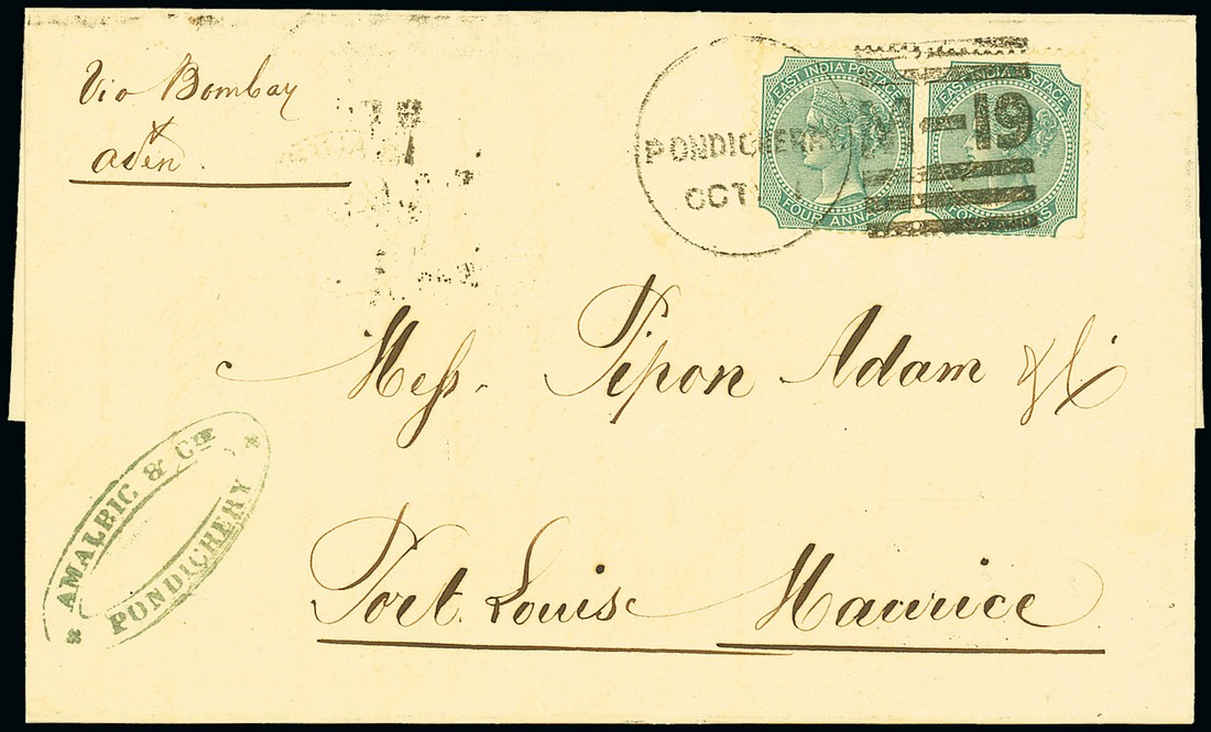 1874 (1 Oct.) entire letter "via Bombay & Aden" to Mauritius, bearing 4a. green pair sharing superb "m-19" duplex, the reverse with Sholapore (3.10), Bombay (5.10), Aden Steamer Point (12.10) and arrival (27.10) datestamps; clean and most attractive. Photo