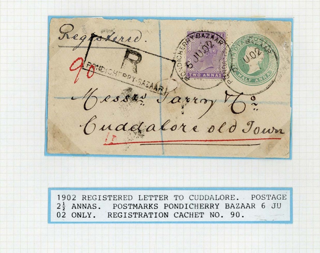 1902 envelopes (3, all registered) to Cuddalore Old Town, all franked at 2½a.cancelled by single-ring datestamp and showing framed registration cachet, 1915 card, 1924 1a. on ½a. envelope, 1936 picture postcard (unaddressed) and 1940 envelope to France, all cancelled by double-ring datestamp in three different types