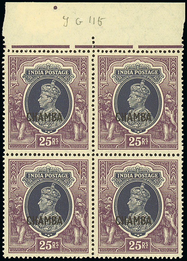 1942 on stamps of 1937, ½a. to 25r. set of eight (15r. with watermark upright) in blocks of four, fresh and fine mint with either full or large part original gum. A rare set of blocks this fine. Murray Payne Certificate (2014). S.G. 100-105, 106a, 107; £5532. Photo for 15r.