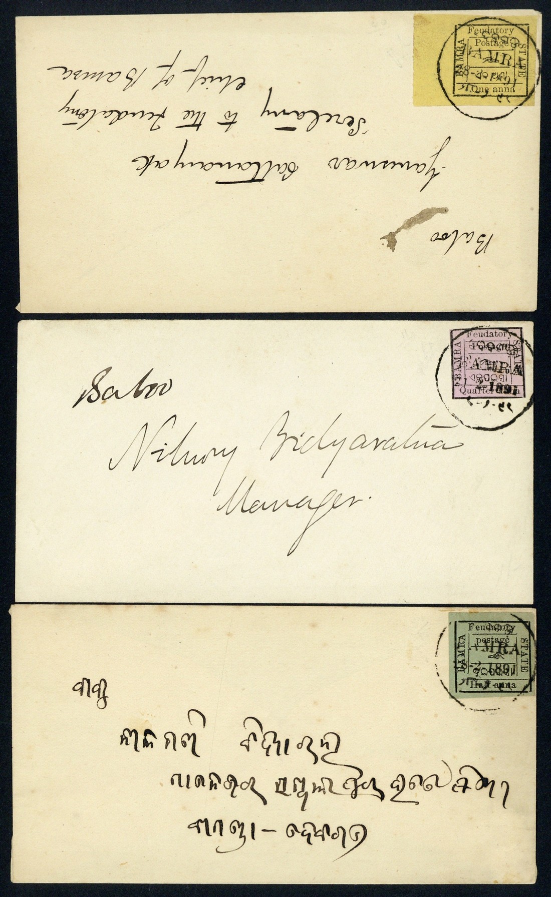 1890-93 ¼a. rose-lilac with capital "P", ½a. dull green with small "p" and 1a. bistre-yellow with capital "P", each neatly cancelled by c.d.s. on individual envelopes addressed locally; the ¼a. cut close, otherwise fine