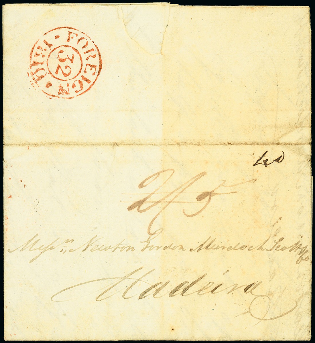 1809 (20 Dec.) entire letter from A. Gordon Caulfield at Kishenaghur to Madeira ordering the annual pipe of wine to be delivered care of the Bengal Medical Establishment at Calcutta, carried by hand to London and sent by the Falmouth packet Duke of Montrose, prepaid "2/5" for single rate letter and with fine "foreign" c.d.s. on reverse, "40" reis postage due from addressee; partially toned face panel though believed to be the earliest recorded postal item from Kishangarh. Photo