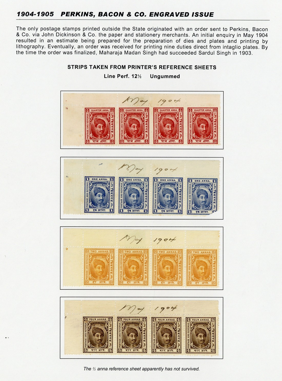 1904-10 issue collection neatly mounted and written-up on twenty-one pages, including ¼a. and 1a. to 5r. upper left corner horizontal strip of four from the printer's reference sheets with each dated "May 1904" in top margin, a range of colour trials with imperforate ½a. (3) and 1a. (5) imperforate blocks of four on card, 1a. (5) and 2a. perforated blocks of four, 1a. singles (3), 4a. carmine imperforate marginal block of six and 1r. blue imperforate block of four, a range of unused with most values to 5r. in blocks of four or larger, a few usages on document, Officials with values to 8a. and Postal Stationery ½a. carmine and 1a. blue die proofs. A fine offering of these attractive stamps