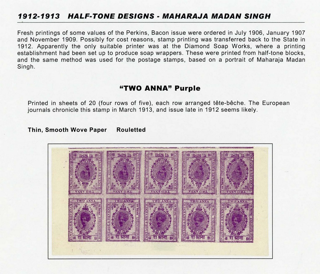 1912-16 issues collection neatly mounted and written-up on twenty pages, including 1912 "two anna" deep violet unused block of ten comprising five tête-bêche pairs, ¼a. ultramarine (4, two used), 1913 "two annas" marginal example with roulettes omitted at base, 1913 ¼a. sheet, 1913-16 unused set of nine, ¼a., ½a. and 8a. unused sheets, 5r. block of four and strip of four, a few used on documents and Officials with values to 1r. (unused), 1a. complete used sheet and 8a, used block of four