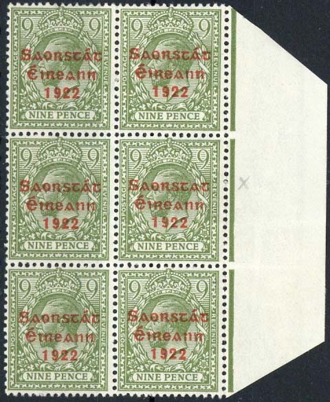 1922-23 Thom 9d. olive-green, a block of six (2x3) with margin at right, one showing variety no accent, unmounted mint (including the variety) or part original gum; a few perfs separated between stamps and selvedge, gum bend crosses the variety but does not detract. S.G. 61/61a, £315
