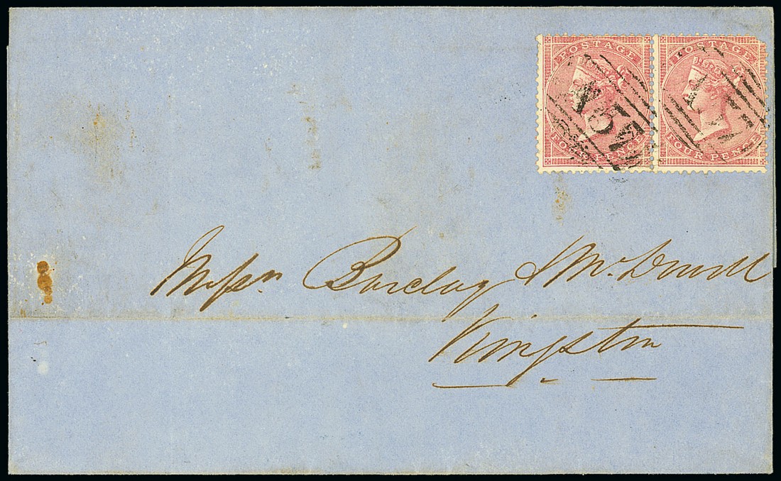 1859 (23 May) entire from Montego Bay to Kingston, bearing G.B. 4d. rose pair (one corner defective) both cancelled "A57", despatch and arrival (25.5) c.d.s. on reverse. Photo