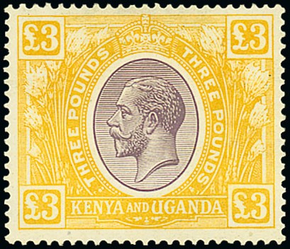 1922-27 £3 purple and yellow, fresh unmounted mint; light horizontal gum bend and three thin specks; very fine appearance. S.G. 98, £2,500. Photo