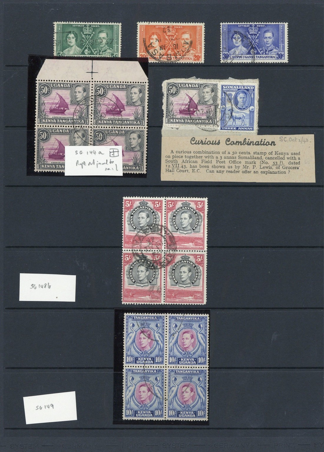 1937-60 largely used range (115) including 1938-54 50c. marginal block of four, one rope not joined to sail, 10/- perf. 13¼ block of four, 1941-42 20c. on 6d. vertical pair with trial overprint (B.P.A. Certificate, 1977) and 70c. on 1/- corner block of six including crescent moon flaw, 1954 1/- vertical strip of three each handstamped diagonally with large "specimen", 1960 £1 block of four on piece, etc; generally good to fine
