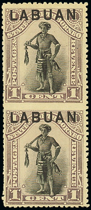 1894-96 Pictorial, 1c. black and grey-mauve, perf 13½-14, a vertical pair showing variety imperforate between, a few shortish perfs otherwise fine unused with part original gum. Rare. S.G. 62ba, £1200. Photo