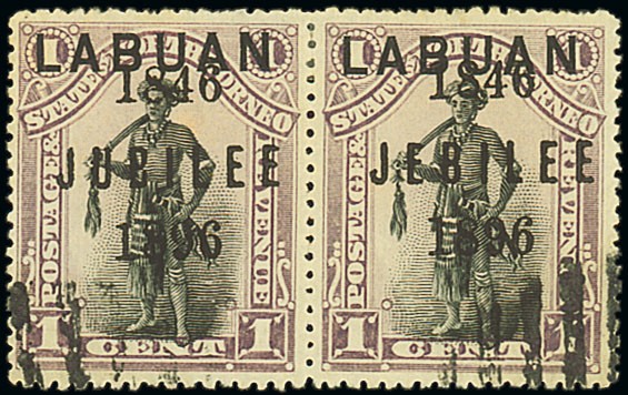 1896 (Sept.) Jubilee 1c. black and grey-mauve horizontal pair, perf 14½-15, the right stamp showing variety "jebilee" (R.8/7), fine cancelled to order. S.G. 83c, £300. Photo