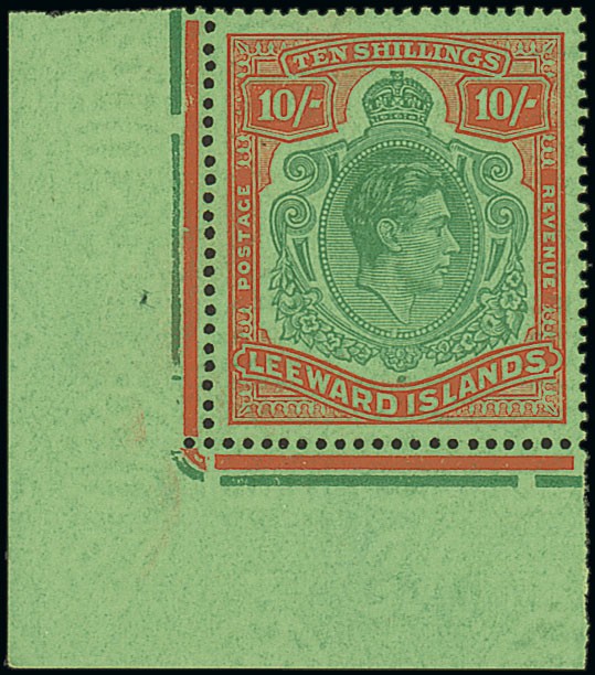 1938-51 10/- deep green and deep vermilion on green, ordinary paper, a lower left corner example showing variety missing pearl, fresh and fine unmounted mint. Rare. S.G. 113ca, £1700. Photo