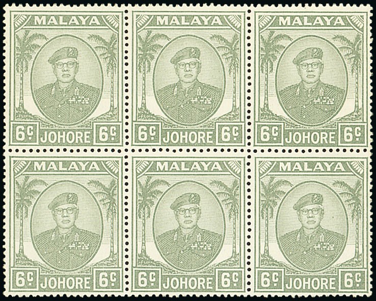 1949-55 6c. pale grey block of six (3x2) showing St. Edward's Crown across stamps 1 and 2, fine unmounted mint. Very rare. Murray Payne Certificate (2014). S.G. 137ac, £3000. Photo