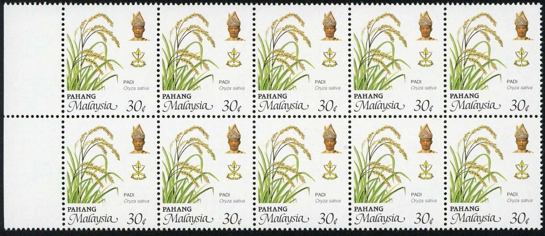 1986-96 30c. rice, block of ten (5 x 2) from the left of the sheet, variety brownish grey (background) omitted; fine unmounted mint. S.G. 131ca, £1,100+