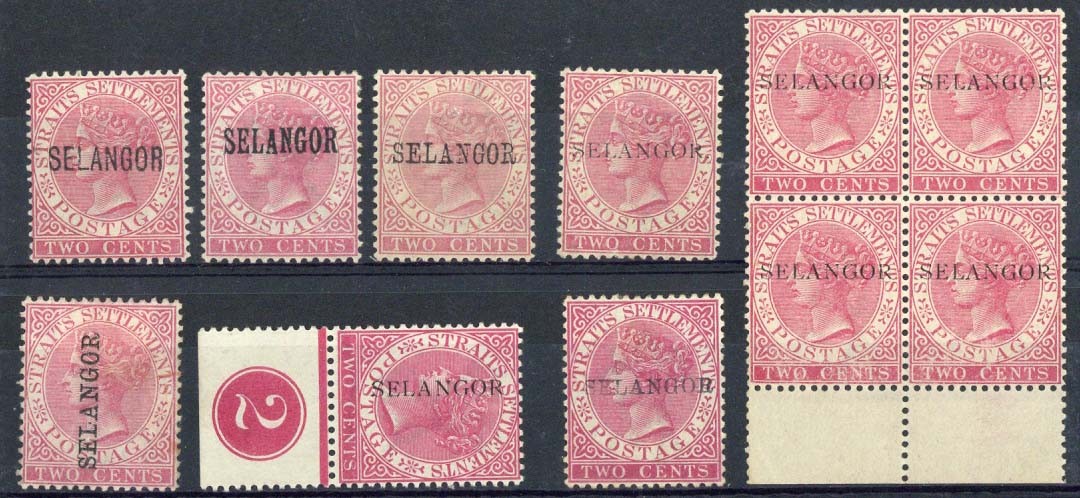 1885-91 on Straits Settlements 2c. pale/bright rose comprising Types 24, 26, 27, 28 without stop (marginal block of four), 28 with stop, 30, 28 vertical (marginal with plate number) and 33, generally fine mint. Cat. £600+