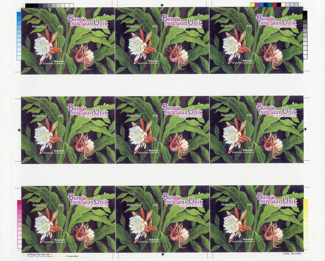 2008 Unique Flowers 5r. miniature sheet, complete uncut, imperforate pane of nine (3 x 3), fine unmounted mint. S.G. MS1520var.