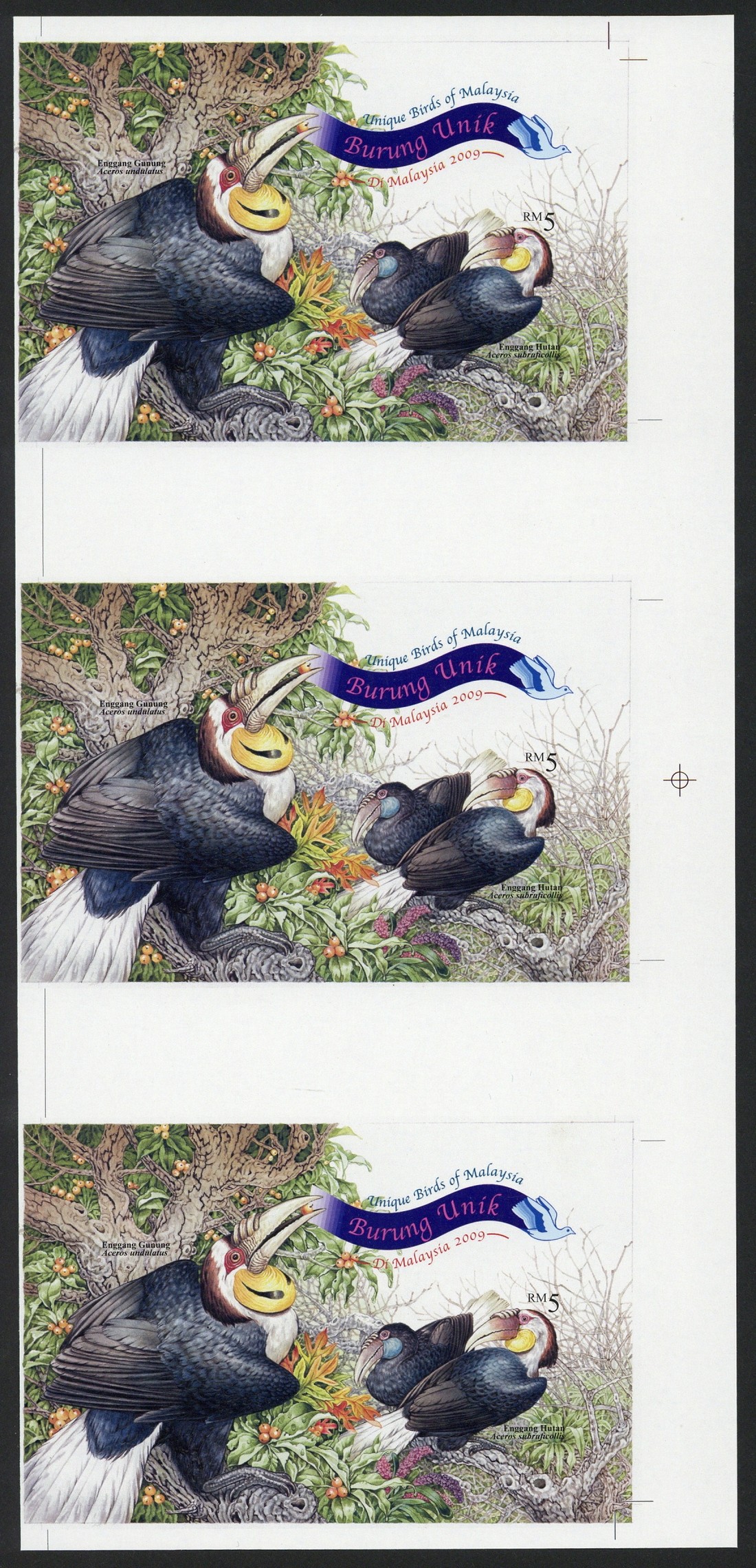 2009 Unique Birds of Malaysia 5r. miniature sheet, unissued design (Aceros undulaus), uncut sheet of three, fine.