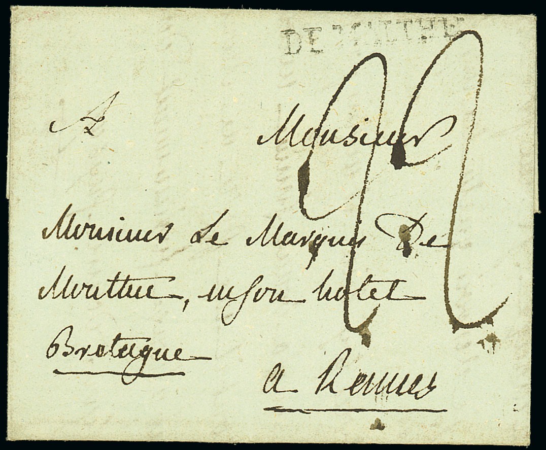 1756 (c.) entire to the Marquis de Mouthier at Rennes showing a good strike of the "de malthe" handstamp (DME) at top; fine. Photo