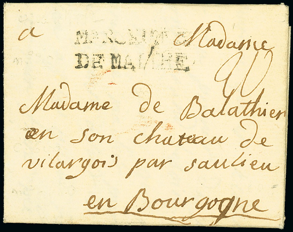 1772 entire letter to Bourgogne, rated "90" and showing fair to fine strike of "marseille/de malthe" handstamp (M/DM). Photo