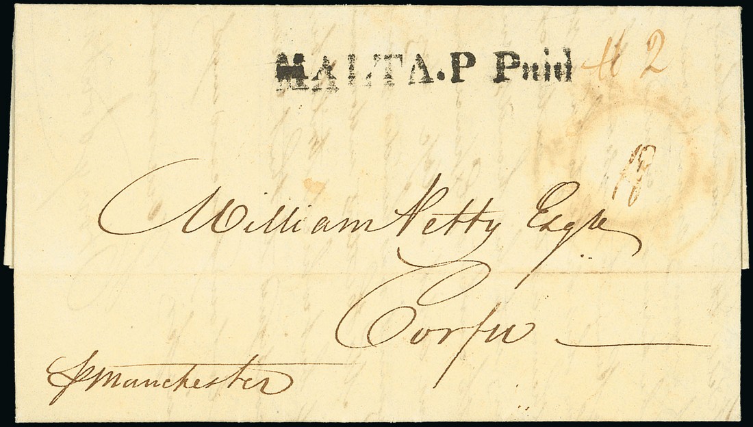 1819 (2 Mar.) entire letter "p Manchester" to Corfu showing partially double strike of the exceptionally rare "malta.p. Paid" handstamp with only one other example recorded, alongside faint "isole/ionie" handstamp. Photo