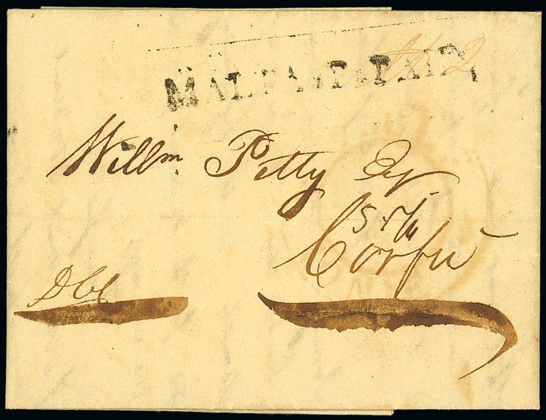 1820 (12 Oct.) entire letter to Corfu showing largely fine "malta*p*paid," handstamp (the earliest recorded example) alongside faint "isole/ionie" double-ring handstamp. Photo