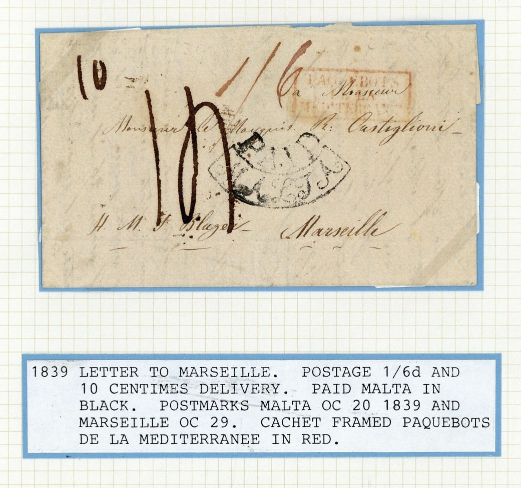 1839 small entire to Marseilles, showing fine curved-framed "paid/malta" (MSP-1c) and boxed "paquebots/de la/mediterranneé" in red