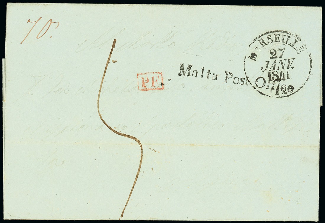 1841 entire letter addressed in a light hand to Algeria, showing superb "Malta Post Office" (MPO-1a) handstamp, framed "pf" in red and Marseilles transit c.d.s., Toulouse and arrival (6.2) on reverse. Photo