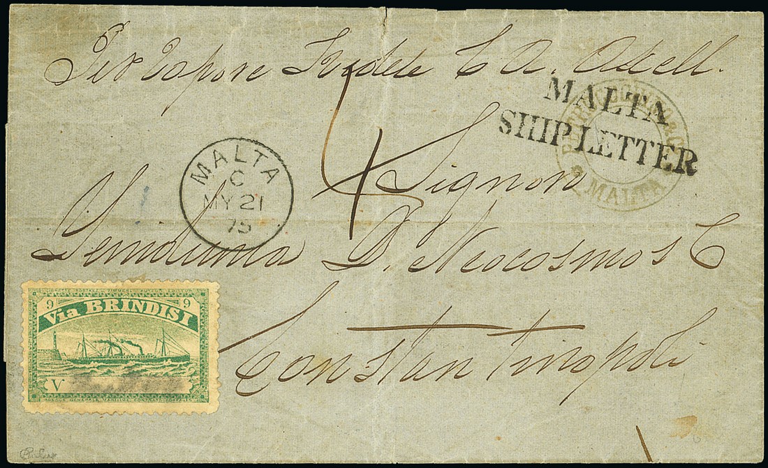 1875 (21 Apr.) entire to Constantinople, rated "4" and showing sender's cachet overstamped by a superb strike of the "malta/ship letter" handstamp with despatch c.d.s. alongside, bearing extremely rare "Via brindisi" perforated label in green with indistinct ships name at foot in manuscript, British Post Office arrival c.d.s. (29.5) on reverse. Only two examples of this label on cover have been recorded. B.P.A. Certificate (1962). Photo