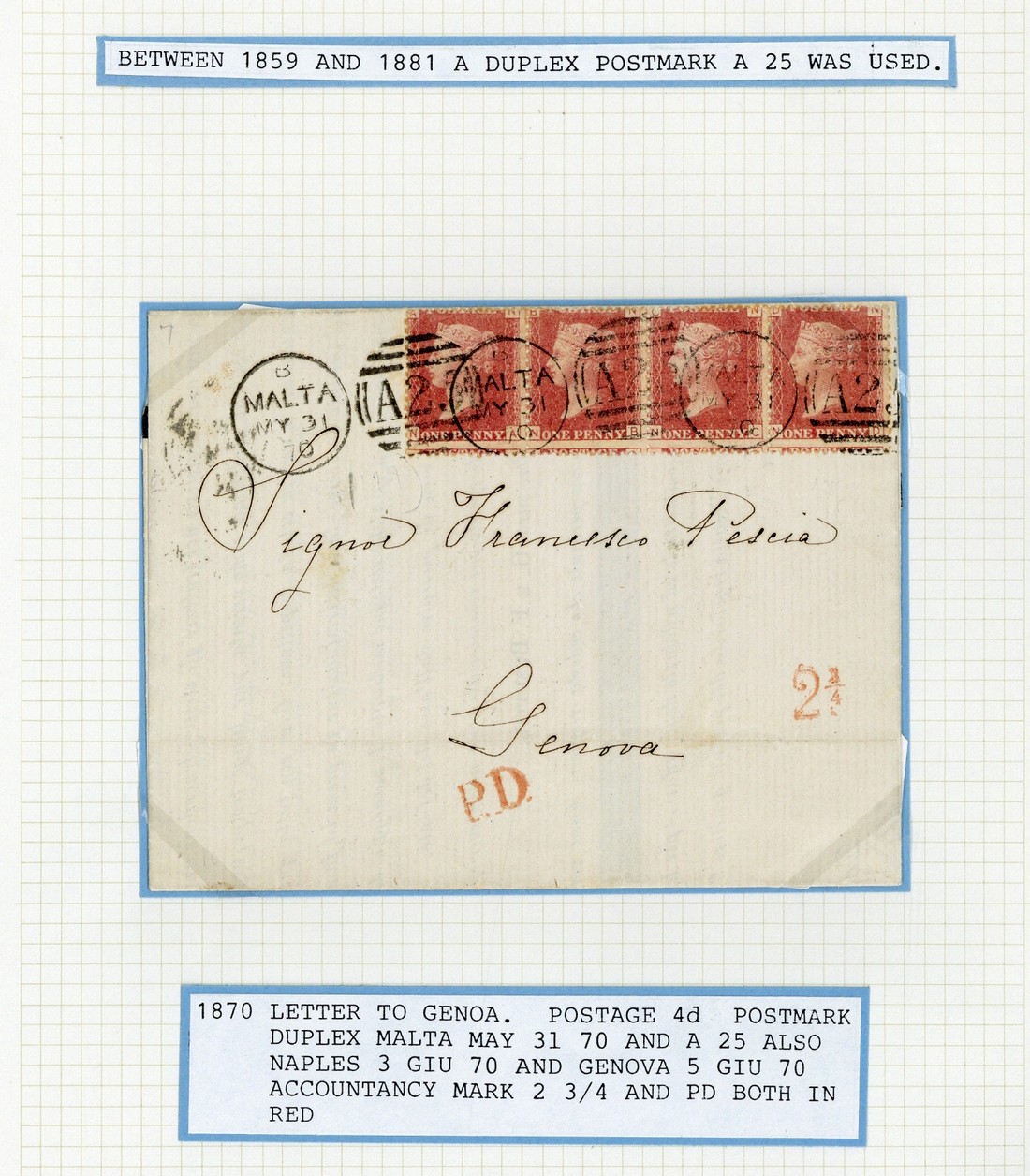 1871 entire letter to Genoa bearing 1d. red strip of four and 1871 entire letter to Messina bearing 4d. vermilion Plate 12, both showing "p.d." and "2¾" accountancy handstamp in red, 1883 Prices Current to Sira bearing ½a., all three with oval duplex, and 1882 entire to Livorno bearing 2½d. blue Plate 22 with upright oval duplex; fine strikes