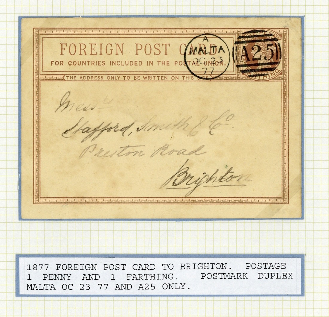 1877 (23 Oct.) 1¼d. brown card (a little soiled) to Stafford Smith & Co. cancelled by a superb oval "A25" duplex, 1882 and 1884 2d. G size registered envelopes, the first to Hamburg bearing 2½d. Plate 23 cancelled with oval "A25", the second to Winch Brothers bearing 2½d. lilac with vertical "A25"