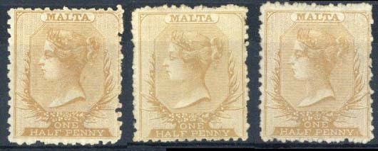 1863-81 rough perf. 12½, ½d. buff-brown (3), unused with part original gum. S.G. 14, £480