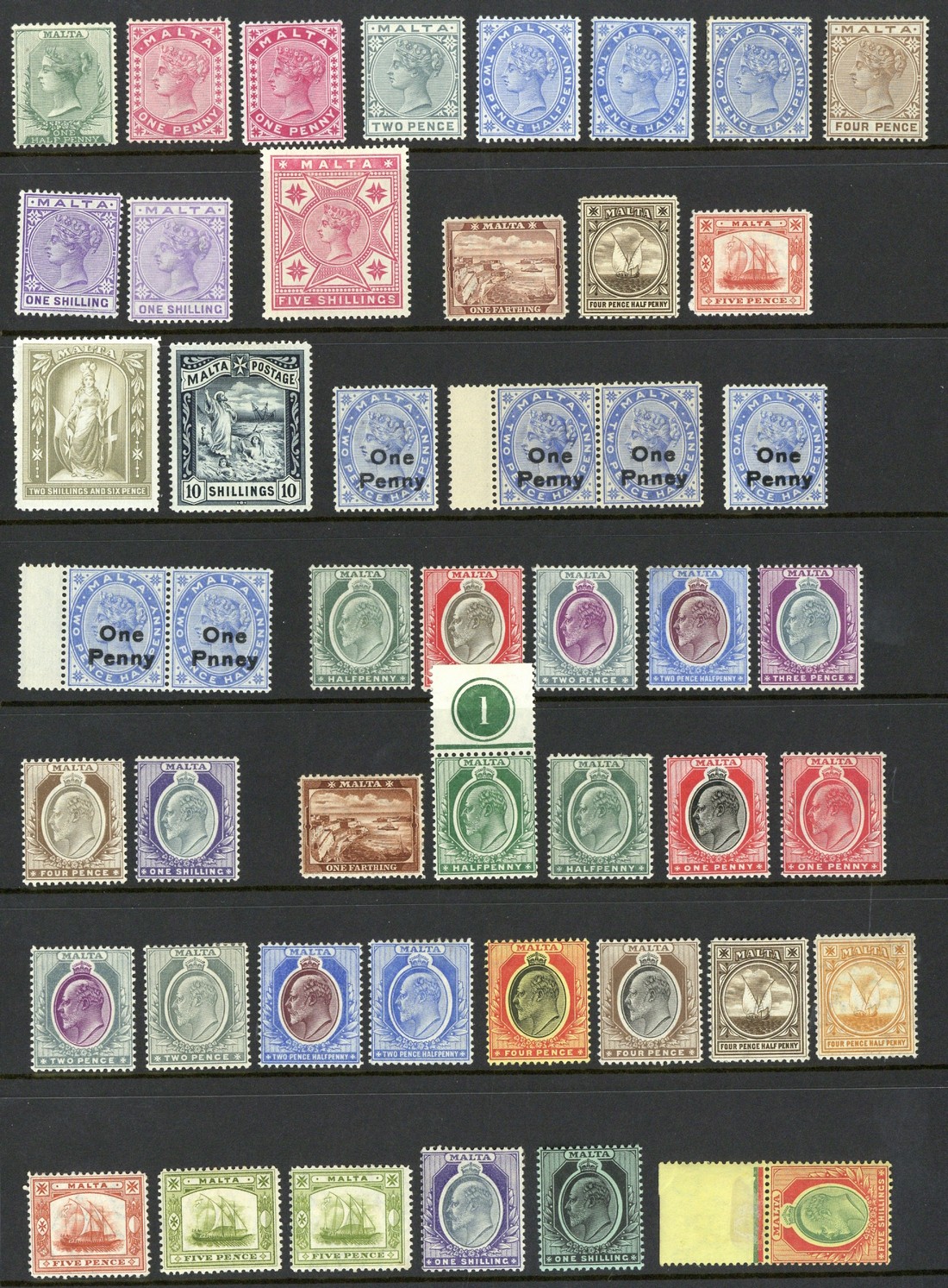 1885-89 ½d., 1d. (both shades), 2d., 2½d. (3), 4d. and 1/- (2), 1886 5/-. 1899-1901 ¼d. to 10/-, 1902 surcharge with errors, 1903-04 CA ½d. to 1/- and 1904-14 MCA ¼d. to 5/-, fine mint. S.G. 20-63, £1000+