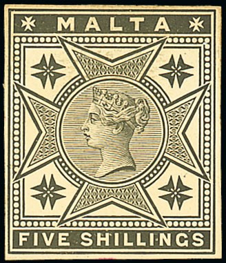 1886 5/- stamp-size die proof in black on glazed card, marked "19/8/85 120 leads" in pencil on reverse. Photo