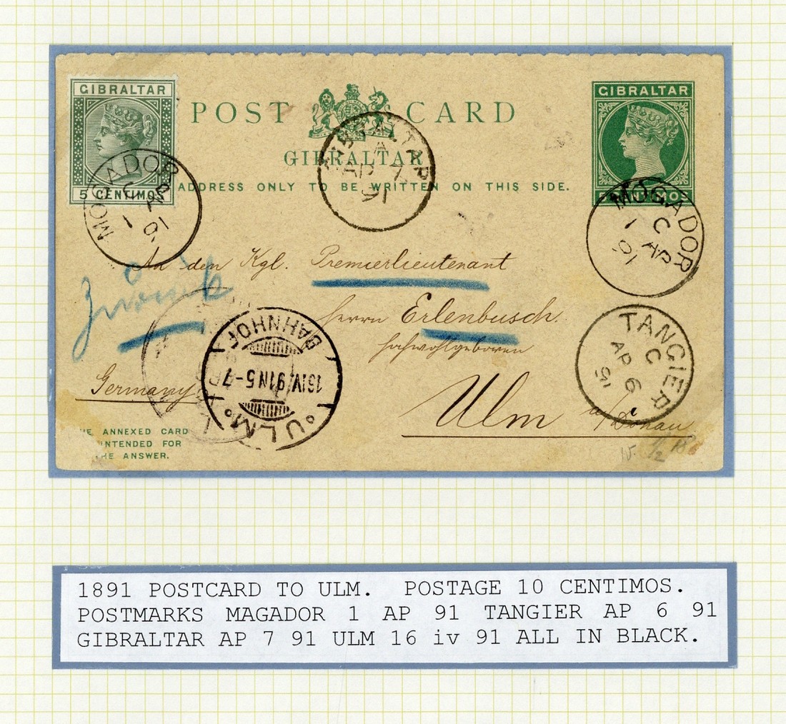 1891 (1 Apr.) outward half of 5c. card, uprated with 5c., to Germany, both cancelled by superb c.d.s. and showing Tangier (6.4), Gibraltar (7.5) and arrival (16.4) c.d.s.; to small corner abrasions, otherwise fine; scarce