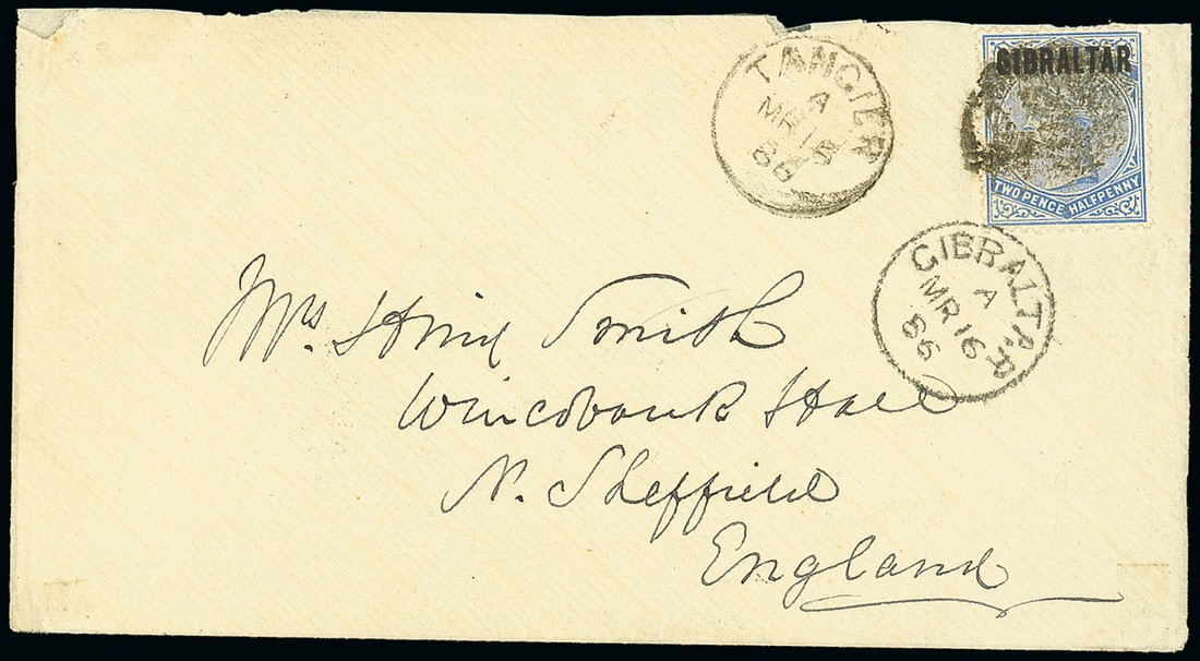 1886 (16 Mar.) envelope to England, bearing 1886 (Jan.) Gibraltar overprint 2½d. blue with worn "A26" obliterator with Gibraltar (16.3) c.d.s. alongside, Sheffield (22.3) and Wincobank (22.3) c.d.s. on reverse; the earliest of the five first issue covers recorded from Tangier. Photo